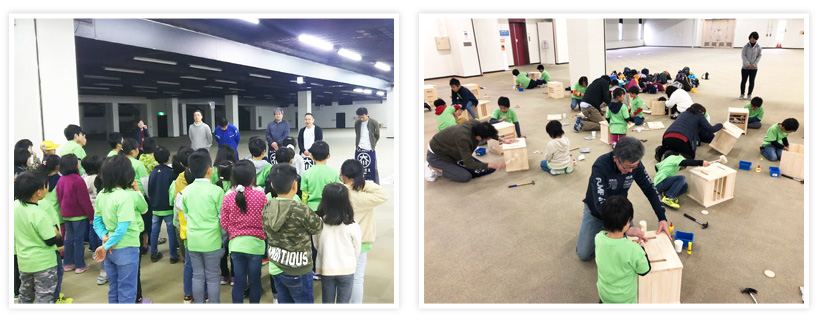 | このワークショップは、二川放課後児童クラブの課外授業の一環として当組合に要請があったものです。 当組合が家具の製造等を行うメーカー133社が集まる団体であること、また、昨今の木育や木づかいの場が増えていることをふまえ、子どもたちがモノづくりの楽しさや木とふれあう事で木工の魅力を知る機会になればとの思いで開催いたしました。 |